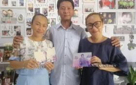 Volintine (centre) with his siblings Josephine (right) and Jennifer holding up photos of their late parents who embraced Islam. - NSTP/YUN MIKAIL.