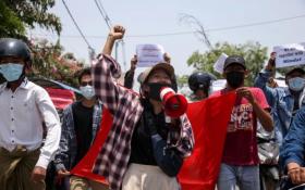 A demonstrator shouts slogans during an anti-military coup protest in Mandalay, Myanmar. -EPA pic