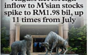 8 月流入马来西亚股市的外国净流入飙升至 19.8亿令吉,是 7 月的 11 倍以上