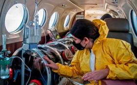 Andrea Lara (right) looks at her father Juan Carlos Lara, 59, a patient with COVID-19, as he is transferred inside a security capsule on an air ambulance from Iquitos to the Intensive Care Unit of the Rebagliati Hospital, in Lima. - AFP pic
