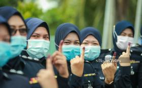 Some of the police personnel showing their index finger covered in indelible ink, after casting their vote at Sabah police headquarters in Kota Kinabalu. - NSTP/ASWADI ALIAS.