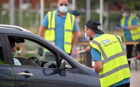 Workers wear NHS Test and Trace branded Hi-Vis jackets as they work at a COVID-19 testing centre in Bolton, northern England on September 15, 2020, as local lockdown restrictions are put in place due to a spike in cases of the novel coronavirus in the city. - The UK government recently imposed tougher coronavirus restrictions in northwest England, as it voiced fears about rising infection rates ...