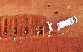This picture taken in Jakarta on September 16, 2020 shows gravediggers (C) carrying a coffin during a funeral for a victim of the COVID-19 coronavirus at the Pondok Ranggon cemetery in Jakarta. - AFP pic