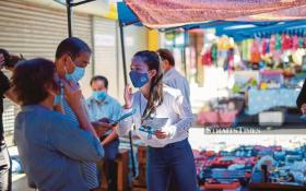 Barisan Nasional’s Likas candidate Dr Chang Kee Ying (right) handing out brochures on the campaign trail in Kota Kinabalu yesterday. PIC BY ASWADI ALIAS