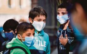 Martin Collinge (centre) wearing a protective mask wait with other pupils for his return to his secondary school at the Sacre Coeur de Lindthout, in Brussels, yesterday. (Photo by JOHN THYS / AFP)
