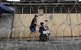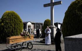 A priest reads the book of funeral rites and common prayers during a funeral service for a victim of COVID-19 at the cemetery of Envie, near Cuneo, northwestern Italy, during the country's lockdown aimed at curbing the spread of the COVID-19 infection, caused by the novel coronavirus. (Photo by MARCO BERTORELLO / AFP)