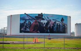 A mural with figures from Texas Revolution is featured on the side of an oil storage facility tank at the Vopak Terminal Deer Park on April 21, 2020 in Houston, Texas. - AFP