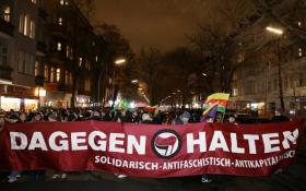People hold a banner while attending a vigil for the victims of a shooting that left several people dead in Hanau near Frankfurt, as mourners march in Berlin, Germany, February 20, 2020. - REUTERS/Christian Mang