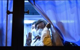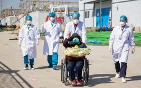 A recovered patient (in wheelchair), is discharged from Leishenshan Hospital, the newly-built makeshift hospital for novel coronavirus patients, in Wuhan in China's central Hubei province. - AFP