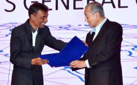 Prime Minister Tun Dr Mahathir Mohamad giving award to Datuk Richard Morais during the Launching Ceremony of Perdana International Anti-Corruption Champion Fund today. (BERNAMA)