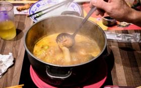 In this photo taken on February 11, 2020, a customer spoons out some food as he eats with a group of friends at 66 Hotpot, a family-run restaurant in the bustling district of Mongkok in Hong Kong. -AFP