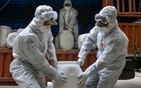 Chinese paramilitary police officers wearing protectieve gears transfer pails of disinfectant in Yunmeng county, outside Xiaogan City in China's central Hubei province. -AFP