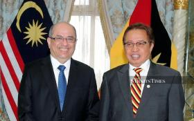 Sarawak Chief Minister Datuk Patinggi Abang Johari Abang Openg receives a courtesy call from Media Prima Bhd group chairman Datuk Dr Syed Hussian Aljunid at his office in Kuching. -NSTP/Mohd Radzi Bujang