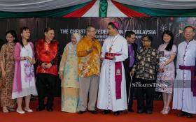 Foreign Minister, Datuk Saifuddin Abdullah (5th from left) speaks to Catholic Archbishop of Kuala Lumpur, Julian Leow Beng Kim (5th from right) after the photo session during the Christian Federation of Malaysia Hi-Tea event in conjunction of Christmas day celebration in Kuala Lumpur. -NSTP/Aizuddin Saad