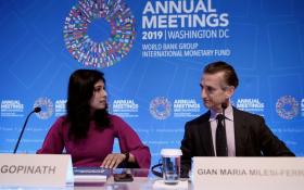 Gita Gopinath, IMF Chief Economist and Director of the Research Department and Gian Maria Milesi-Ferretti, IMF Deputy Director, Research Department arrive at a briefing during the IMF and World Bank Fall Meetings on October 15, 2019 in Washington, DC. (Photo by Olivier Douliery / AFP)