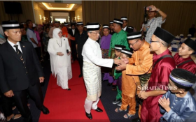 KUANTAN: The Yang di-Pertuan Agong, Al-Sultan Abdullah Ri'ayatuddin Al-Mustafa Billah Shah, and the Raja Permaisuri Agong, Tunku Azizah Aminah Maimunah Iskandariah, attended the Hari Raya Aidilfitri open house hosted by Menteri Besar Datuk Seri Wan Rosdy Wan Ismail here today.