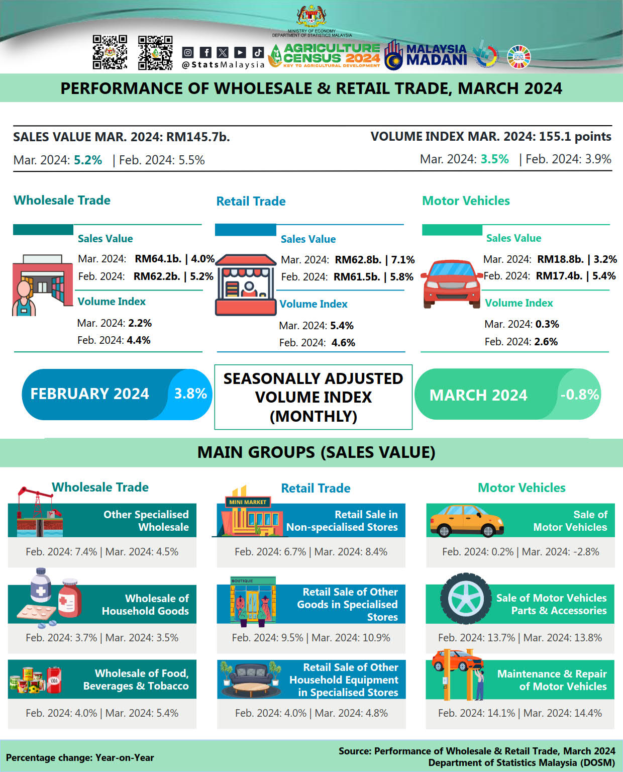 Malaysia's wholesale and retail trade recorded a 5.2% rise in March 2024 with monthly sales of RM145.7 billion versus the same month a year ago, according to the Statistics Department Malaysia (DOSM).